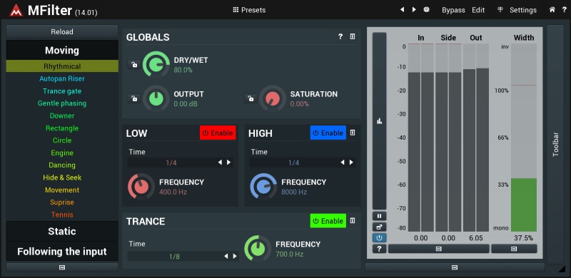 MFilterは、ワウワウ、スイープなどの効果を提供できる4つのグローバルモジュレーターを備えたMEqualizerの特別に変更されたバージョンですが、MFilterは、標準の効果で想像できるよりもはるかに進んでいます。