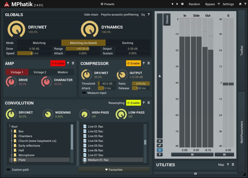 MPhatikは、アンプ、コンボリューション、コンプレッサーを備えたユニークなダイナミックマルチエフェクトで、オーディオをウォームアップしてから元のダイナミクスを復元できます。